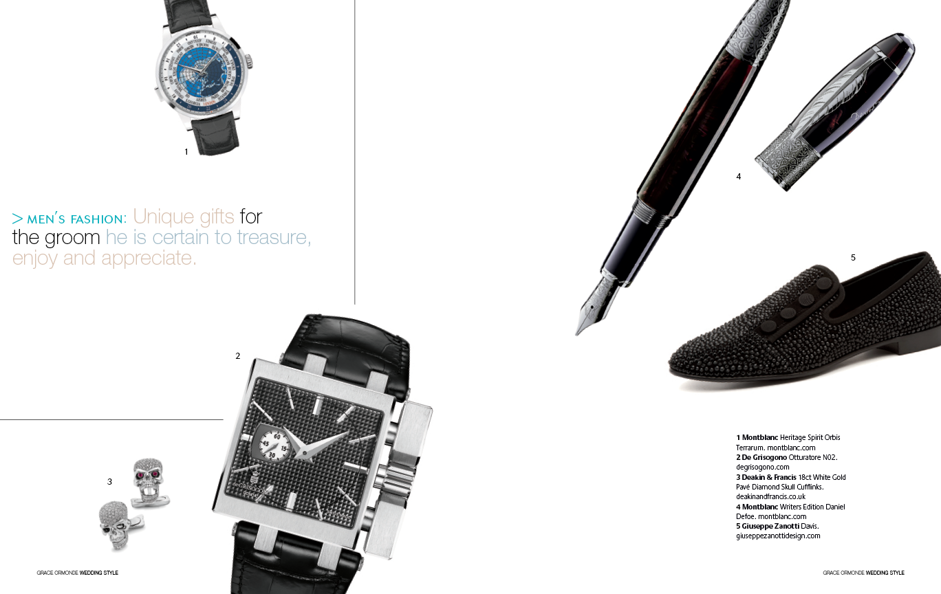 1 Piaget Polo Perpetual Calendar Obsidian Watch. 2 Seaman Schepps Cushion Cufflinks in Blue Topaz and Sapphire. 3 Ulysse Nardin Diver Watch. 4 Seaman Schepps Lapis Bar Cufflinks. 5 Jimmy Choo Foxley Loafer Black with Tassel.MEN’S ACCESSORIES: DISTINCT ACCENTS FOR HIM1 Ulysse Nardin Diver Watch. 2 Brunello Cucinelli Calfskin Loafers. 3 Soul of Nomad Leather Golf Bag.