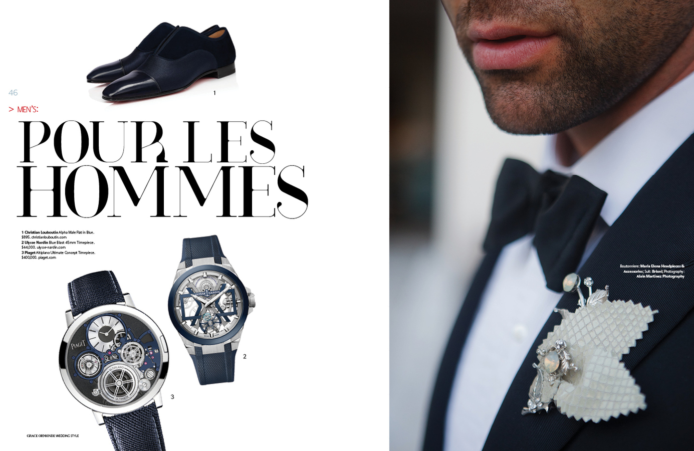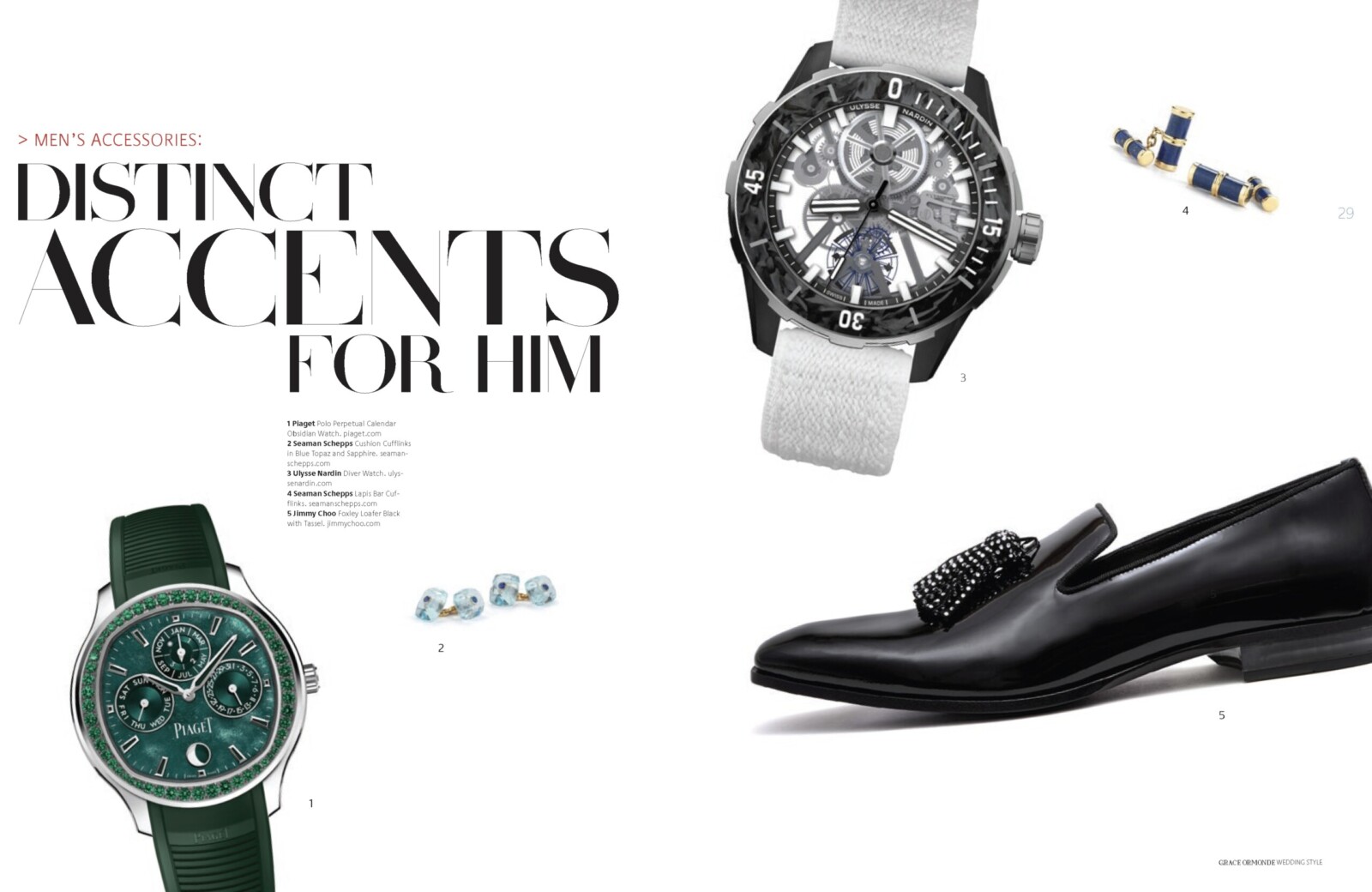 1 Piaget Polo Perpetual Calendar Obsidian Watch. 2 Seaman Schepps Cushion Cufflinks in Blue Topaz and Sapphire. 3 Ulysse Nardin Diver Watch. 4 Seaman Schepps Lapis Bar Cufflinks. 5 Jimmy Choo Foxley Loafer Black with Tassel.MEN’S ACCESSORIES: DISTINCT ACCENTS FOR HIM1 Ulysse Nardin Diver Watch. 2 Brunello Cucinelli Calfskin Loafers. 3 Soul of Nomad Leather Golf Bag.